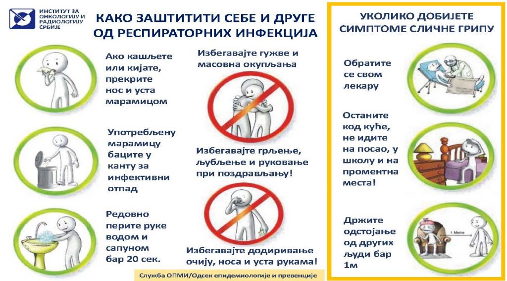 U cilju prevencije širenja respiratornih infekcija, na ulazu u Institut je postavljeno obaveštenje za pacijente i sve druge osobe koje dolaze u Institut da se, ukoliko imaju simptome respiratorne infekcije, odmah po ulasku jave medicinskoj sestri na šalteru informacija (ulaz 1, Pasterova 14).